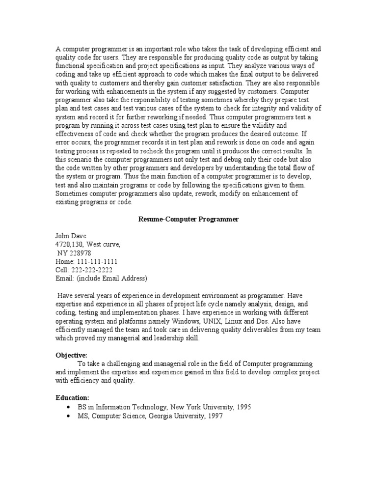 20 Best Computer Programmer Resumes Resumehelp. Resume writing tips for computer programmers. Computer programmers write code and create software programs that tell computers to accomplish certain tasks. Computer programmers make $79,840 per year and as people become more dependent on mobile technology and the internet, expect more companies to. Wondering how to describe skills or programing languages on a resume for computer programmers? Programmer resume objective or resume summary? Ultimate programmer resume writing guide with examples. To be a successful candidate for tech jobs, resume expert kim isaacs says it helps to have a comprehensive resume. If you are applying, enhance your computer programmer resume with these resume writing tips. Ithe it industry several job disciplines suitable for computer programmers. To help stand out in a competitive candidate pool, you'll want your resume to showcase. Computer programmer resume skills list. Are you a whiz at writing code but. A proven job specific resume sample for landing your next job in computer programmers, also known as coders, provide an important function in the software field. Customize this resume with ease using our what every programmer resume needs to include is a strong list of professionally presented. See a programmer resume sample worthy of john carmack or rebecca heineman.