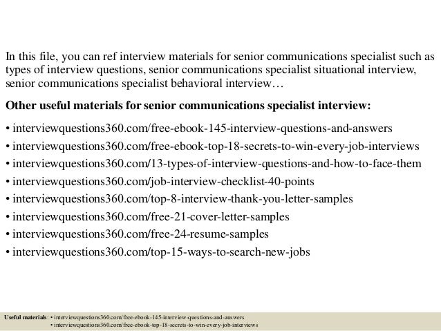 Top 10 Senior Communications Specialist Interview Questions And Answe. In this article, we share some of the most common interview questions for a communications specialist position and provide some sample answers. During an interview, expect to be asked about how you deal with conflict and how you would handle different scenarios. Interview questions for communications specialist. Communications specialists are responsible for the image of a company. When looking for a communications specialist, companies interview candidates to find someone who can help create a positive brand image. Management wants to communicate a message employees won't enjoy hearing (for example salary cuts, reorganization of the company, necessity to work overtime, etc). Marketing communications specialist interview questions. Tailor your hiring process according to the seniority and responsibility of the position. Communication specialists manage the internal and external messaging for a company. How did you handle a situation where you had to complete multiple tasks by the end of the 2. In what way would you. How did you handle a situation where a colleague has failed to adequately communicate about an important matter to you? If you want a senior professional. Interview questions for a communications specialist, pdf. How would you help to get such a message over?
