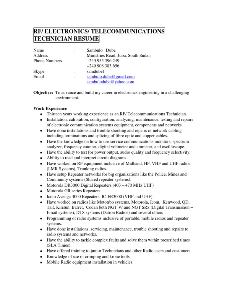 Get Telecommunications Technician Resume Gif. Example of resume for network technician with 15 years of experience in it and telecommunications. Telecommunications technician resume examples & samples. Download sample resume templates in pdf, word formats. No telecommunications technician resume is complete without a mention of database software proficiency. The sample telecommunications technician resume will help you to build your own resume for sample telecommunications technician resume. Let your potential employer know that you're comfortable working with database software. Telecommunications technician resume samples with headline, objective statement, description and skills examples. Richard anderson 1234, west 67 street. This document is an ideal reference for most telecom positions. If you are looking for writing a resume telecommunication technician then look no further. Recommended telecommunications technician resume keywords & skills based on most important skills found on successful telecommunications technician resumes and top skills. 8+ years of experience with providing engineering and testing support to software and hardware systems. Crafting a telecommunications technician resume that catches the attention of hiring managers is paramount to getting the job, and livecareer is here to help you stand out from the competition. Dark fiber solutions, ringwood, ok. Telecommunications technicians install and repair digital communication networks.
