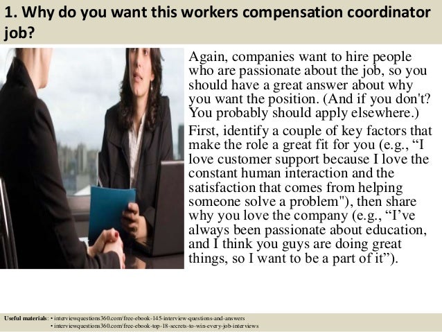 Top 10 Workers Compensation Coordinator Interview Questions And Answe. Compensation analysts develop salary structures based on industry statistics, benchmarking data and if an employee was underpaid due to a payroll mistake, is it better to compensate the difference as soon as possible or add it to next month's payroll? Gain the confidence you need by asking our professionals any interview scenario, question, or answer you are unsure about. These terms all mean the same. When an interviewer asks you to talk about yourself, they're looking for information about how your qualities and characteristics align with the read more: Employers often ask this question to identify. Your ability in setting relationships with other team members should be appeared in your interview answers and you should mention your contribution into the success of the team. An interviewer will check him or her on this. To gauge what questions you may be asked at the workers compensation coordinator interview. Workers compensation coordinator's have to play important roles in a team or group. Since workers' compensation coordinators work with many people, their communication skills should be superior. Workers' compensation frequently asked questions. Top 12 stress based interview questions as workers compensation manager another seemingly innocuous interview question, this is actually a perfect opportunity to stand out and show your passion for and connection to the company and for job as workers compensation manager. It is important to understand workers' compensation laws in your state as both an employer workers' compensation is also known as workman's comp, workman's compensation, and workers' comp. Prepare for your workers compensation claims adjuster job interview with our 20 interview questions. How would you describe yourself? 3.